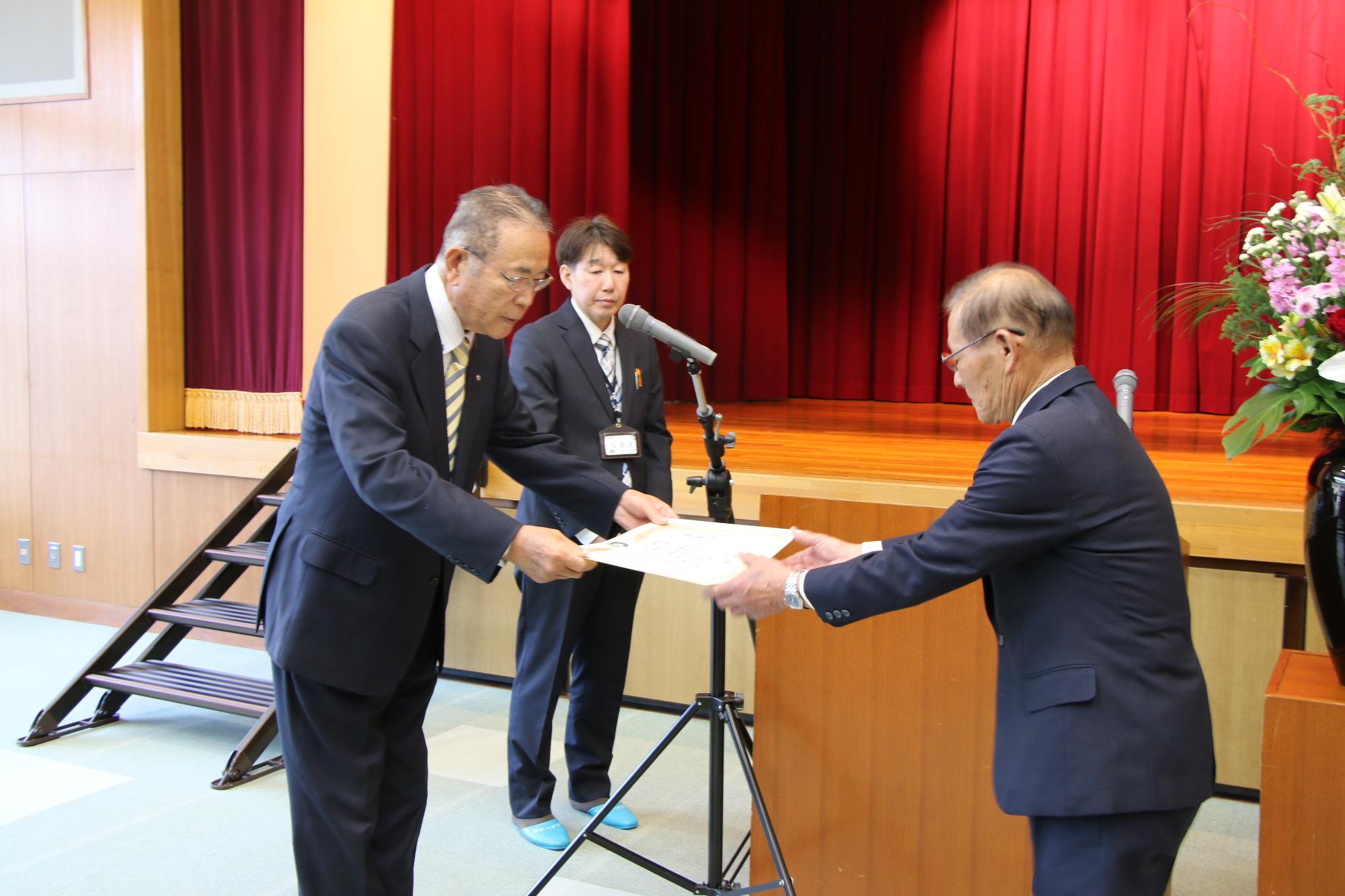 第1部では「大台町表彰」を行いました。これは、町の公益事業や、町が設置する各種委員などに就かれ、長年にわたり町政の発展にご尽力いただいた方々に感謝の意を表すものです。