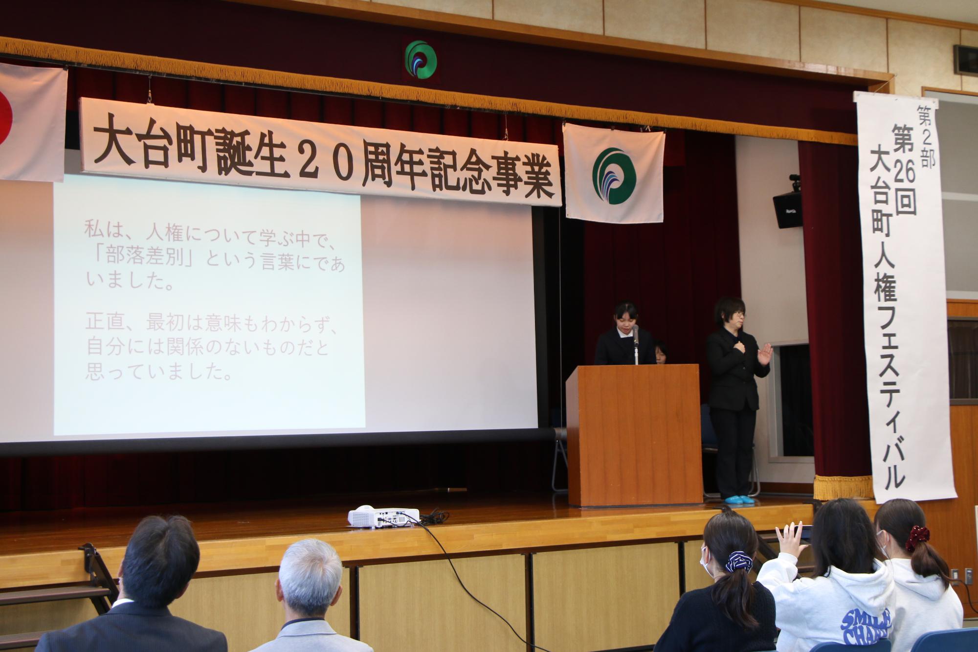 続く第2部では、「大台町人権フェスティバル」を開催しました。中学生による人権作文の朗読や、中高生の集いによる発表が行われ、未来を担う若い世代が人権について真剣に考え、自らの言葉で発信する姿が大変印象的でした。会場に集まった皆さまとともに、人権の大切さを改めて共有する貴重な機会となりました。