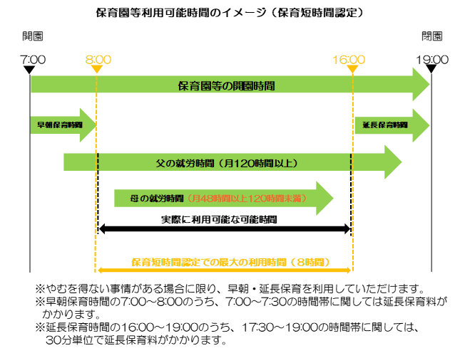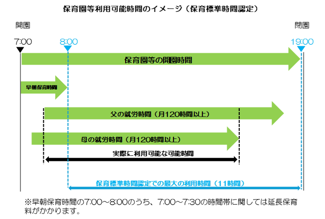 実際の保育利用時間は、保護者の方の就労状況など「保育を必要とする事由」を証明する書類(例:就労証明書等)に基づき、証明された時間内でのご利用となります。