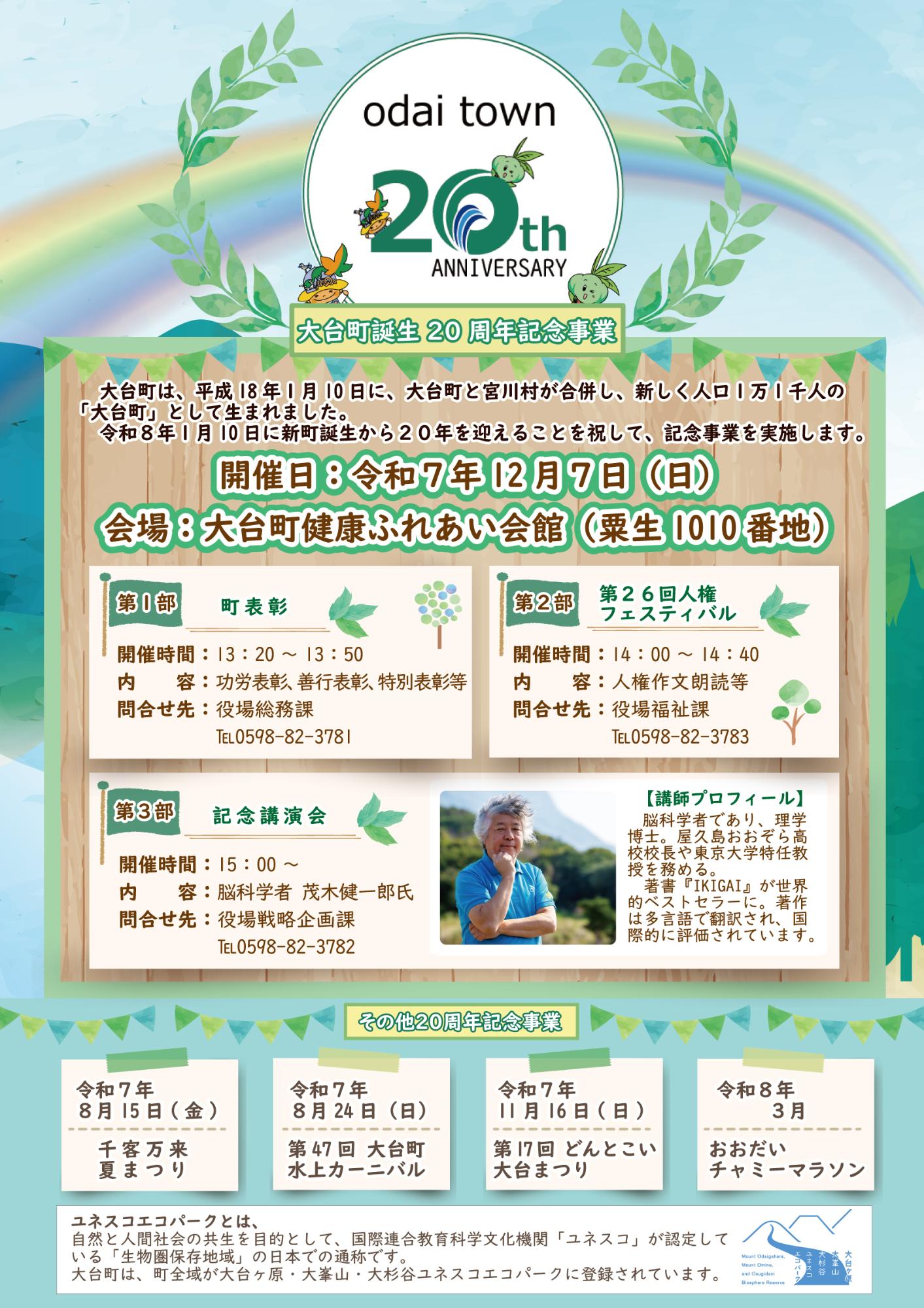 この節目となる機会を捉え、町民の一体感の醸成と活力ある大台町を町内外にアピールするため、大台町誕生20周年記念事業を実施します。